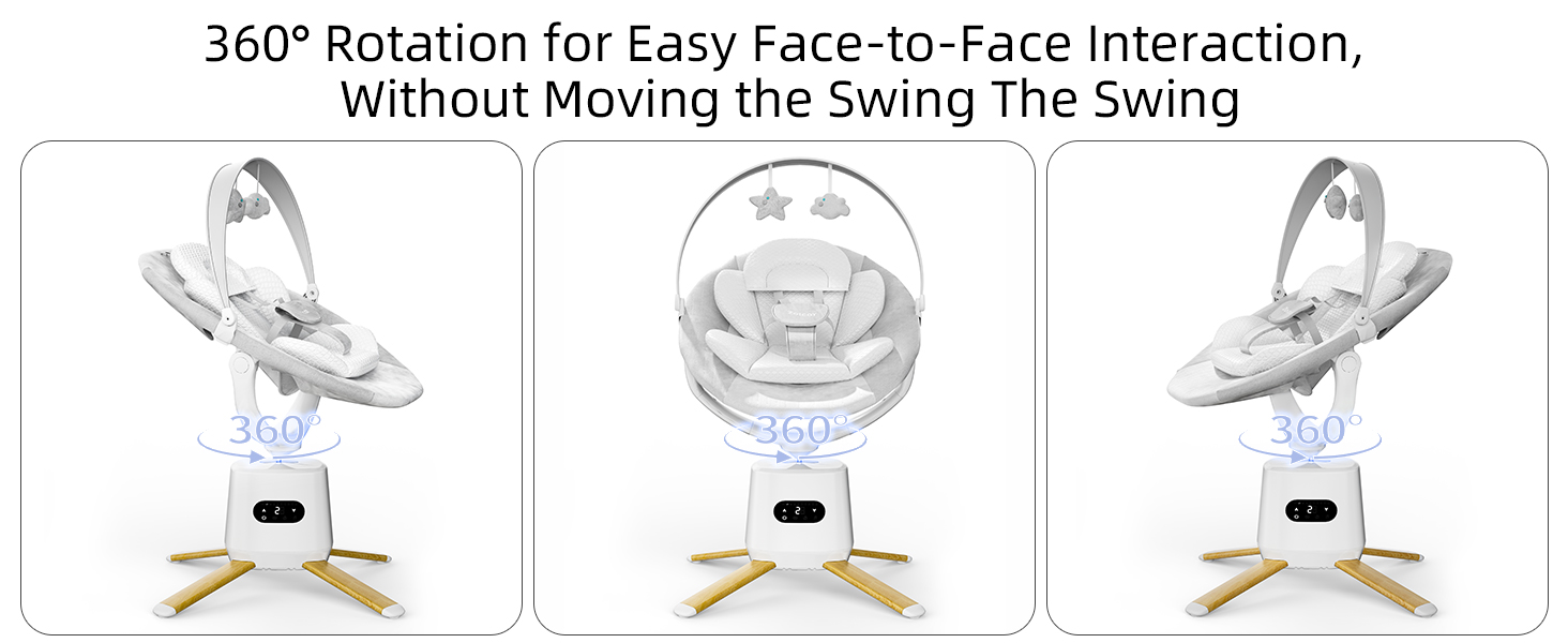 - 360° rotating seat keeps baby always in view without moving the whole swing
