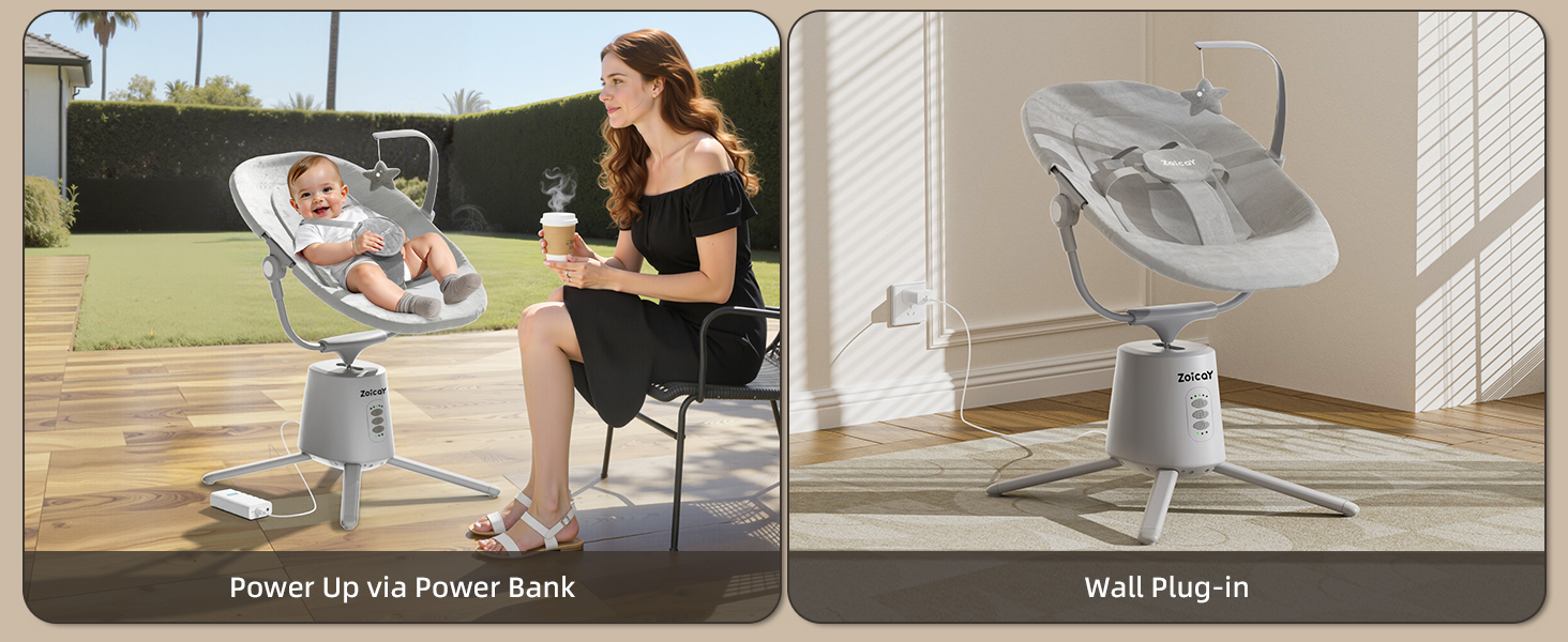 - PORTABLE & CONVENIENT – Our compact newborn swing features quick and easy assembly and this lightweight baby swing supports adapter and power bank use (power bank not included), making it easy to carry and perfect for outdoor use.