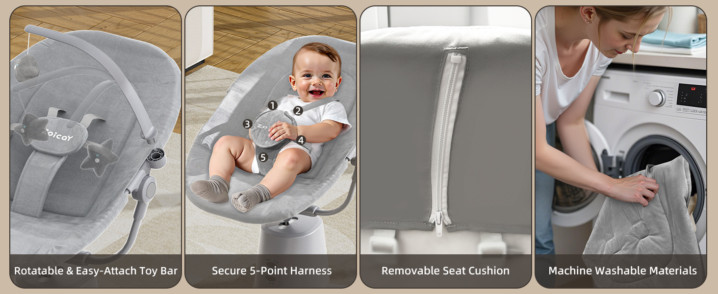 - ERGONOMIC & SECURE SEAT - Designed to perfectly contour to your baby’s back, with two adjustable reclining positions for maximum comfort. The 5-point safety harness keeps your baby securely snug, letting baby enjoy their joyful swings.