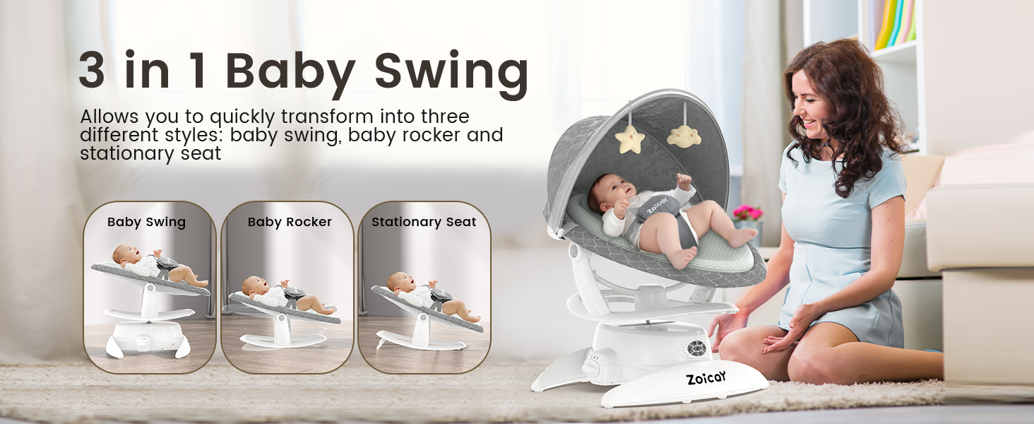 - MORE USER-FRIENDLY DESIGN -- The 3-in-1 baby rocking chair with manual remote allows you to quickly transform into three different styles: baby swing, baby rocker, and baby stationary seat. Four corner support base, so that our load-bearing more prominent, safe and stable