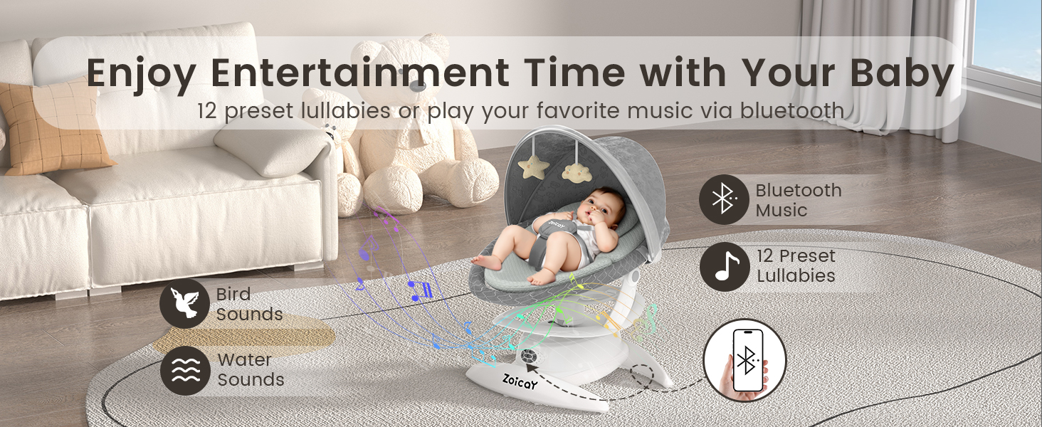 - MULTIPLE SOOTHING MUSIC OPTIONS -- Baby swings for infants built-in 12 classic soothing music, along with the chirping of birds and the sound of water flowing, At the same time, you also connect to Bluetooth to play your favorite music, When playing via Bluetooth, please note that the ringtone or other app sounds will play simultaneously. Please be careful not to startle the baby