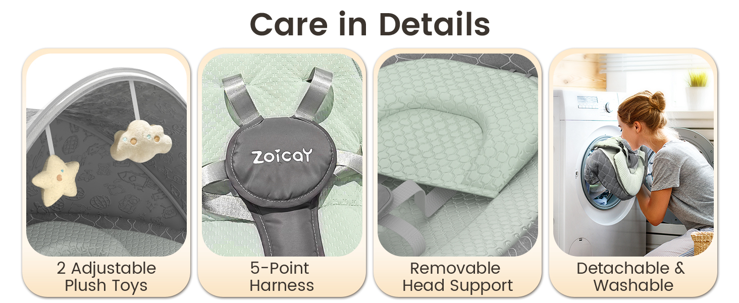 - EASY TO CLEAN AND SAFE COMFORTABLE SEAT CUSHION DESIGN -- Baby swing use 5-point harness design ensures that the harness will not be easily unfastened due to accidental contact, making it even safer when you are not around to take care of it. The fluffy and soft double-layer breathable seat cushion made of premium fabric supports machine washing, freeing up your hands