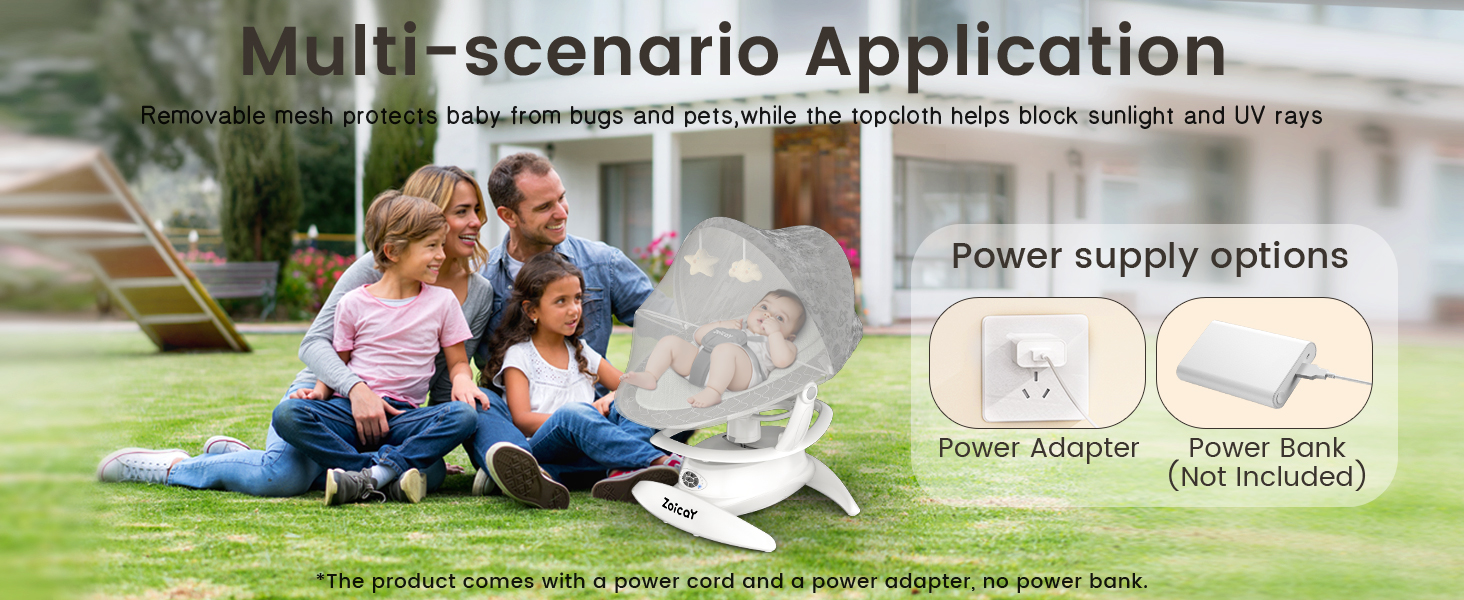 - PORTABLE AND CONVENIENT -- Electric baby swing supports power adapter or DC power. The portable baby swing also supports power banks (power bank not included), Insert the DC plug of the adapter into the power outlet and the USB plug into the mobile power. When you want to travel baby swing outdoor can help you relax outdoors and enjoy outdoor parent-child activities